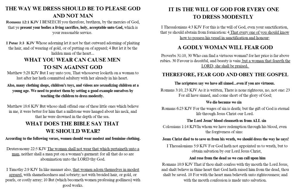 This commandment has gone out of the window in our society. I pass this out to women cashiers, place them in women restrooms, and also on vehicles that look as if a woman drives them. However, I will not hesitate to give it out to a man because he probably has a wife, sister or lady friend, but most importantly this tract clearly presents the GOSPEL.